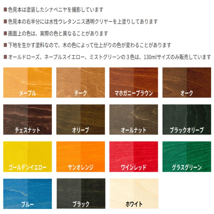 製品仕様内容量1セット/6缶入り(1缶1L)一般名称顔料着色剤色各色ご注意事項モニターの発色の具合によって実際のものと色が異なる場合がございます。ご了承ください。その他商品説明木目を引き立てる水性顔料着色剤
