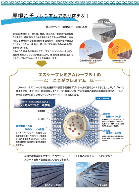 ラジカルコントール技術により紫外線(UV)や水、熱等の劣化要因から屋根材を保護し、優れた耐候性を示します。