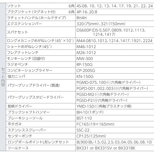 | 特長 | ●自動車整備向けに欠かせない工具を厳選した工具セットです。 |